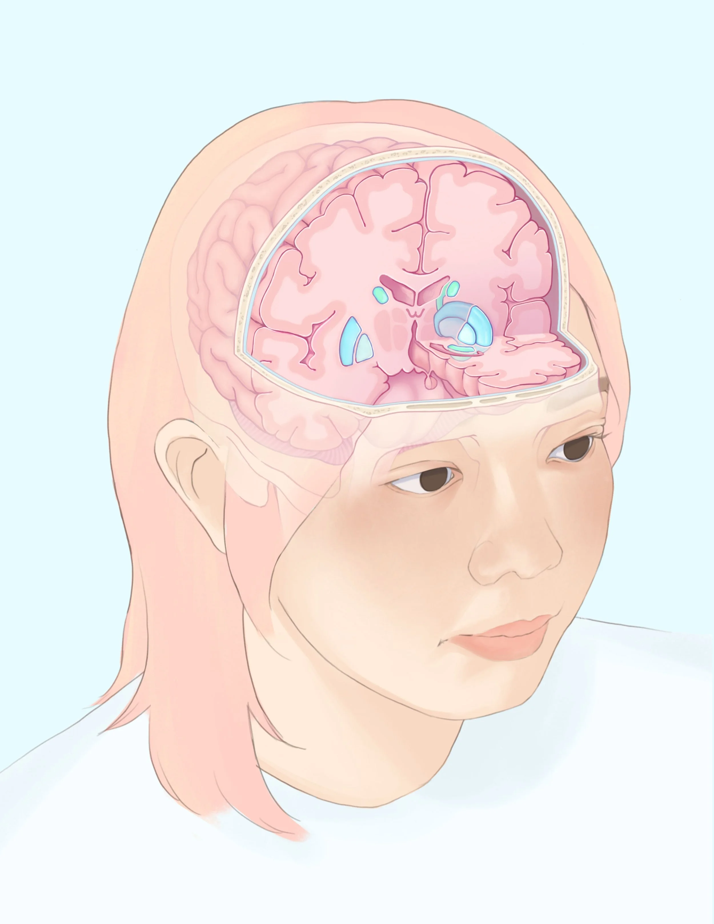 Depicting the basal ganglia– structures in the brain crucial for smooth movement– in a cut section of the brain and skull in situ.